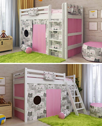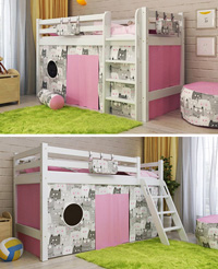 Невысокая детская кровать - чердак Отто 11 имеет уютное игровое пространство снизу, а так же под кроватью удобно будет хранить игрушки. А благодаря яркой и красивой шторке кровать будет смотреться более эстетично. Кровать Отто 11 собирается на оба стороны (левое или правое расположение) - это определяется непосредственно при сборке. Кровать изготовлена из прочного массива сосны.